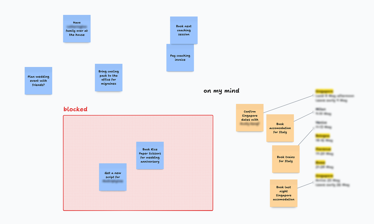 Blocked: things I can’t work on right now because someone else is blocking progress. I label the person’s name on the sticky so that I remember who to follow up with
